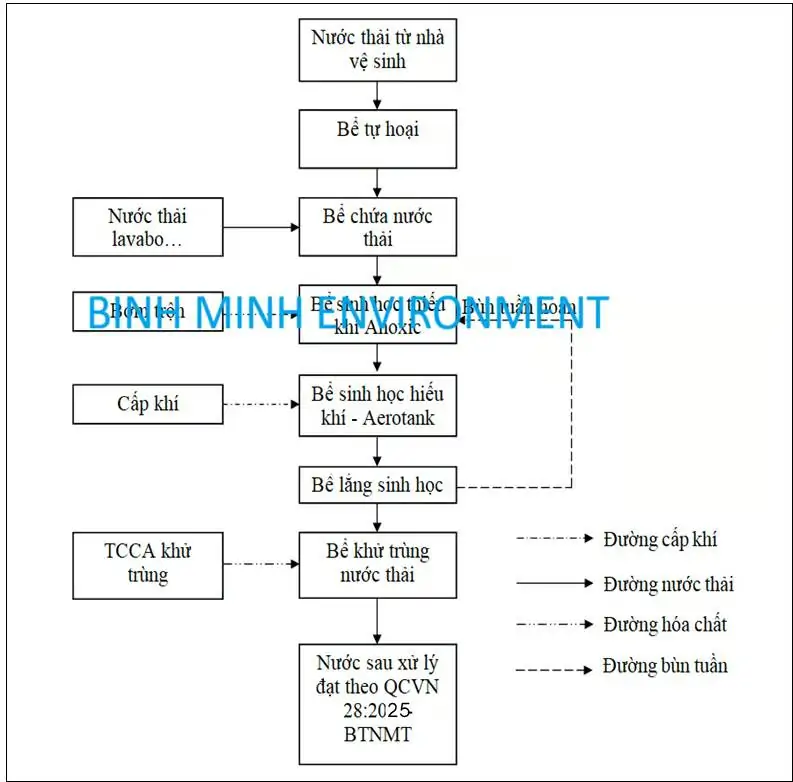 Phần bùn dư được định kỳ bơm về bể tự hoại để phân hủy bùn. Phần nước trong sau xử lý được thu vào hệ thống ống thu nước trong bể lắng và được dẫn sang bể khử trùng.